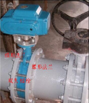 接下來(lái)的這個(gè)圖片就是對(duì)夾蝶閥的一個(gè)安裝示意圖。這上面很明白的產(chǎn)品顯示了安裝部分,應(yīng)該處于的位置。有螺栓也有管道,管子焊在法蘭上,法蘭中間夾著的蝶閥,然后是用雙頭螺栓連接在一起。也有就是使用單頭的六角螺栓來(lái)進(jìn)行安裝的。其實(shí)作用也是一樣的。當(dāng)然這兒說(shuō)的是對(duì)夾式的產(chǎn)品,如果是產(chǎn)品本身自帶法蘭的,是叫做341這樣的一種連接方式,如果看到這樣的一種連接方式,不管他是橡膠密封的或者是金屬硬密封的蝶閥產(chǎn)品。都是配相應(yīng)的壓力的普通法蘭產(chǎn)品就可以了。圖片中所展示的這個(gè)閥門兒叫做電動(dòng)蝶閥這是說(shuō)他的驅(qū)動(dòng)方式。有手柄進(jìn)行。驅(qū)動(dòng)的,也有渦輪驅(qū)動(dòng)的。這個(gè)則是遠(yuǎn)程的。來(lái)操縱它上面的電動(dòng)裝置來(lái)進(jìn)行打開或者關(guān)閉的一種蝶閥產(chǎn)品。這樣的閥門在進(jìn)行操作時(shí),不用到到現(xiàn)場(chǎng)就行的。電路連接到了閥門上,在控制室里面就能時(shí)間閥門的開啟和關(guān)閉了。如果和是否采用蝶形法蘭產(chǎn)品在下面的章節(jié)中有說(shuō)明。